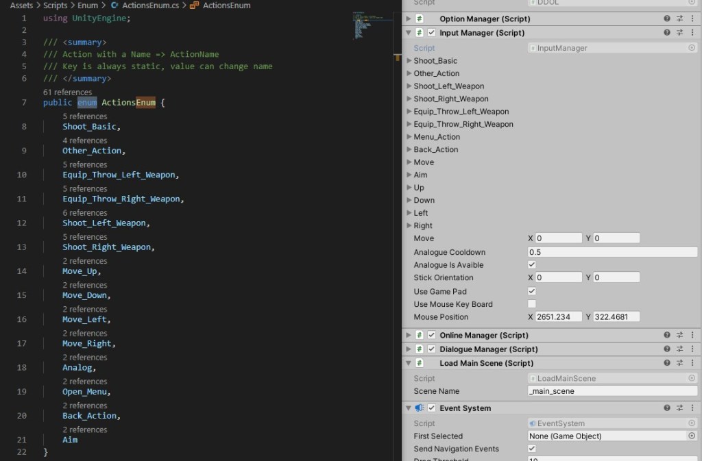 Je vais pas rentrer dans les détails car c’était vraiment chiant, mais j’ai du coder un script maison. En fait, je ne sais plus exactement pourquoi mais la gestion des nouveaux Inputs n’est pas vraiment bien gérée avec les menus et les Canvas (affichage d’élement de menus spécifiques à Unity). J’ai du « lier » de manière visuelle les boutons entre eux dans l’interface (« aller en haut mène à ce bouton, aller à droite mène à ce bouton » etc … pour CHAQUES boutons), créer un script qui me permet de savoir sur quel bouton l’on est, détecter quel direction l’utilisateur entre, pour ensuite me rendre sur cet élément. L’inconvénient de cette méthode, c’est qu’elle n’est pas compatible avec une souris, et l’InputSystem ne me permet pas (ou j’ai pas compris) comment l’utiliser efficacement …