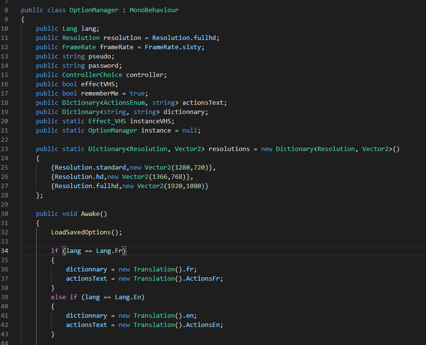 Vous voyez l’idée, il faut partir d’un choix par défaut pour laisser le choix à l’utilisateur de la langue. Il faut peut être donc intégrer un système de sauvegarde de choix de l’utilisateur. Passons ce détail. Pour se faire, j’ai donc listé les langues supportées dans un enum (liste finie qui contient En et Fr, et d’autres encore si j’ai la motive de traduire plus), j’ai donné le choix de la langue dans un OptionManager qui écoute les changements d’options du menu des options, et je serialize / deserialize (sauvegarder en fichier) les choix utilisateurs pour les restituer. Youpi, on a un choix de langue ! Mais on a pas encore de traduction …