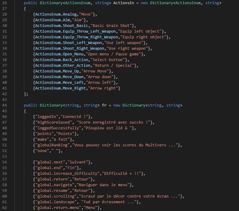Si vous vous demandez comment ça se passe dans ma ptite tête, j’ai cherché de longues heures sans trouver de réponse pour une solution »built-in » de gestion de traduction. Du coup je me suis servi de mon expérience sur Symfony pour créer ma solution maison de la gestion des différentes langues dans mon jeu. Je tiens à préciser qu’elle est sans doute améliorable, et d’ailleurs je serai heureux d’apprendre comment. Voici tout de même ma proposition à base de Dictionnary , Manager et Enum :
