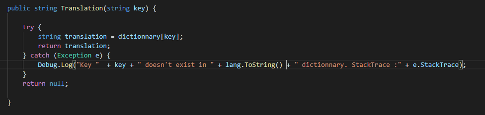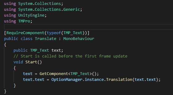 Cette solution offre pour moi une stabilité et une robustesse que je n’ai pas réussi à remettre en question. Je peux grâce à cela, créé un script que je colle sur les objets qui restituent du texte (les textmesh pro). Ils contiennent la clef en claire, et au lancement du jeu c’est traduit car mon script récupère la clef et restitue la traduction.