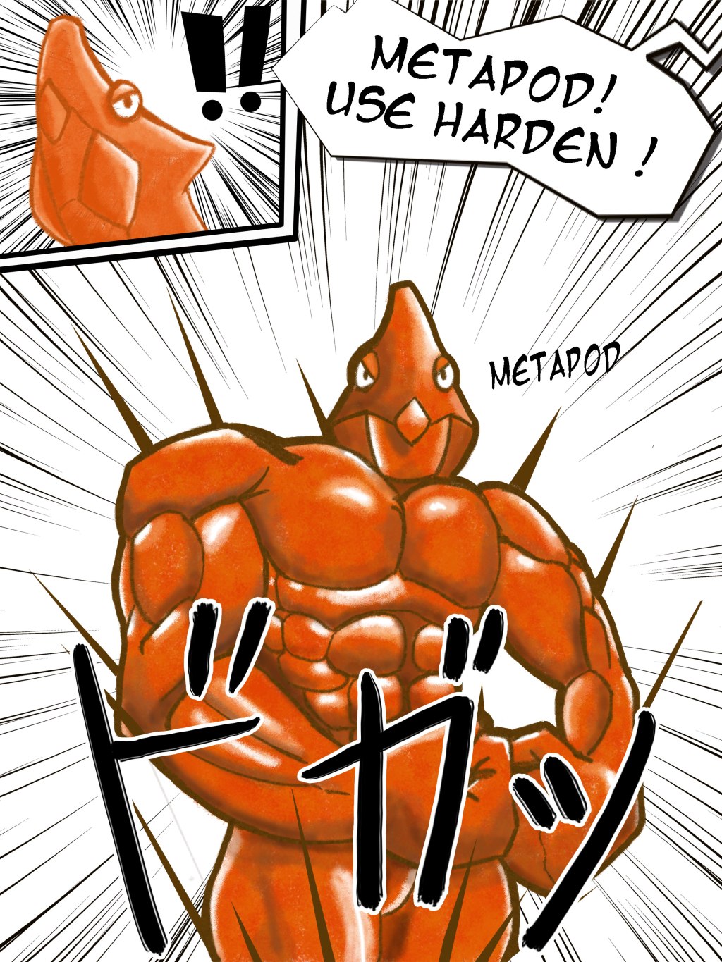 Chrysacier était le plus marrant à dessiner ! Version bodybuildé, en mode manga. C’est une petite référence à Jojo’s Bizarre Adventure, assez connue pour ses bonhommes bourrés de muscles qui se coupent un bras avant de se faire coller des mandales. Un bourre pif bourré d’humour que je recommande beaucoup! J’ai découvert qu’il existait une communauté fan de pokémons bodybuildés. Certains dessins sont très drôle, mais d’autres sont parfois assez gênant XD.