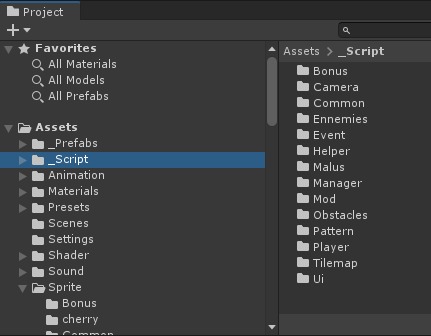 Cela dépend donc du projet car pour un jeu 2D je n’ai pas forcément de 3D. Il est important de très peu déplacer ses assets ! Pour le versionning, cela évite les grosses merges requests, et cela évite, si le jeu doit être mis à jour, d’avoir une très grosse MAJ car Steam fait une différence Avant / Après pour savoir QUOI modifier. S’y contraindre, c’est anticiper les MAJ, mais surtout cela me permet de maintenir une structure cohérente et organisée tout au long du développement, et INTER PROJET ! Peut importe mon projet, j’ai la même structure de base 🙂