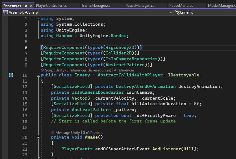 - Je contraint le pattern à la condition que le gameObject auquel le script est attaché ait un RigidBody2D avec [RequireComponent(typeof(RigidBody2D))]. D’ou le dossier 😉