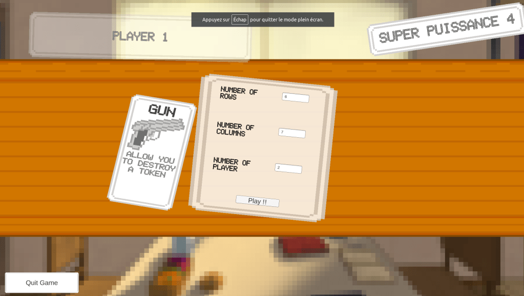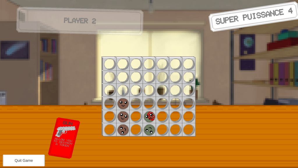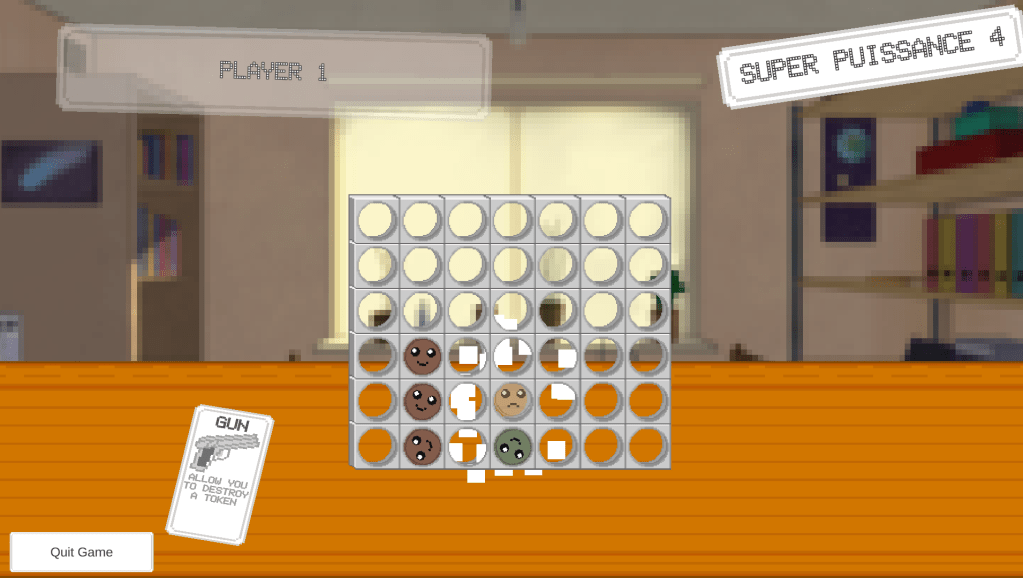 Le but du jeu était simple : créer un Puissance 4 auquel nous pourrions ajouter des règles farfelues très facilement. La première étant que l’on peut tirer avec un pistolet sur un jeton, et que la chute des jetons reprend et change le déroulement du jeu ! Il fallait aussi réfléchir à l’équilibrage global mais sans se prendre la tête, nous savions que le jeu allait être « cassé » car certaines règles donneraient bien sur trop d’avantages au joueur l’utilisant. Les autres règles ont été conceptualisées : pouvoir tourner la grille à 90°, mettre des jetons mines à retardement, des jetons « capricieux » qui vivent leur vie, un algorithme qui fait intervenir les événements aléatoirement… Que des règles relativement simples à développer et facile à ajouter à la suite. Le choix du pixel art a été fait pour accélérer le processus et faciliter l’intégration d’un graphiste, et le temps passé dessus devait être restreint : quelques mois maximum, histoire de se rôder. Les règles devaient être idiotes, amusantes, et simples à développer afin de motiver les différents acteurs et auteurs du projet. Le projet a ainsi été brainstormé entre plusieurs personnes « motivées ».
