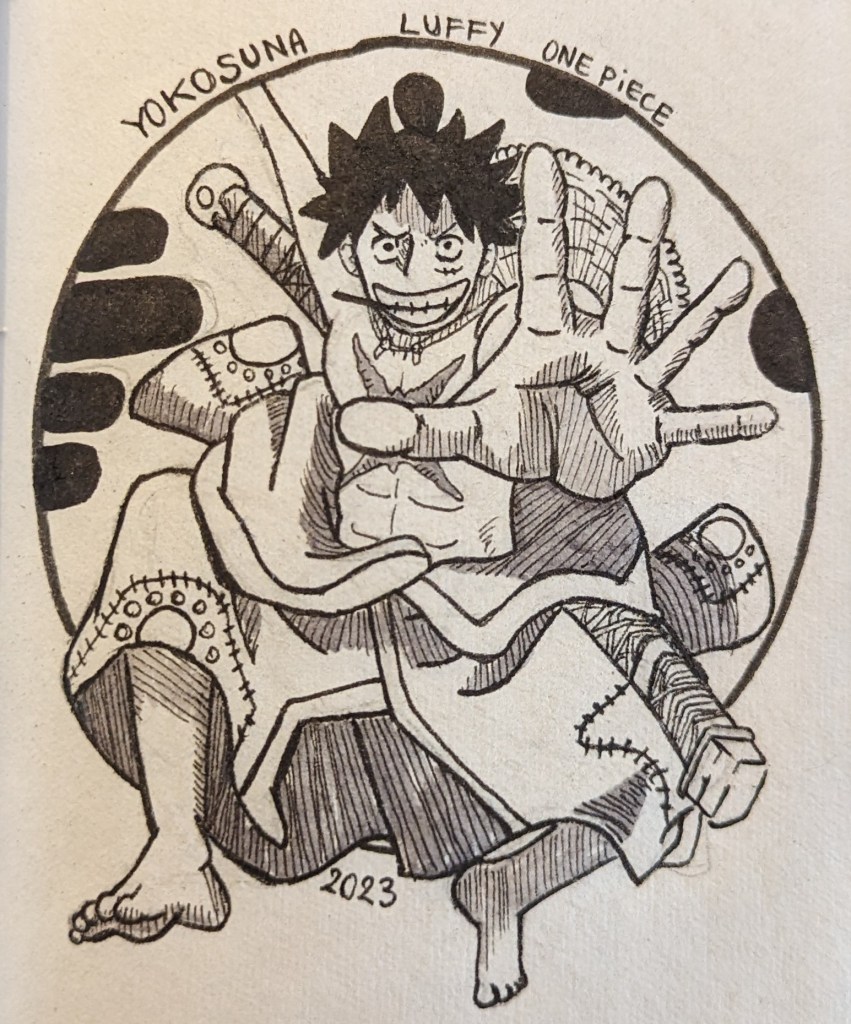 J’ai pris beaucoup de plaisir à dessiner certains personnages dans leurs anciens designs ! Notamment Franky qui est un de mes nakamas préférés :D. Cependant, je dois avouer que l’arc de Wano a proposé les designs des personnages les plus audacieux ! Luffy en yokozuna en est un parfait exemple.