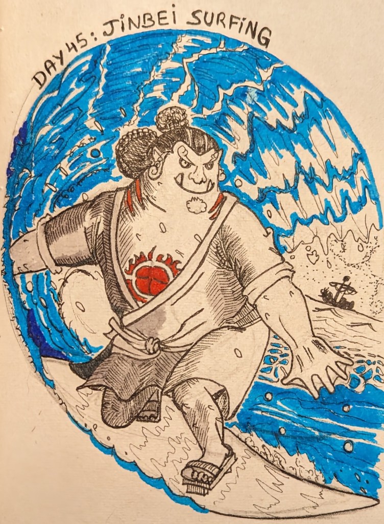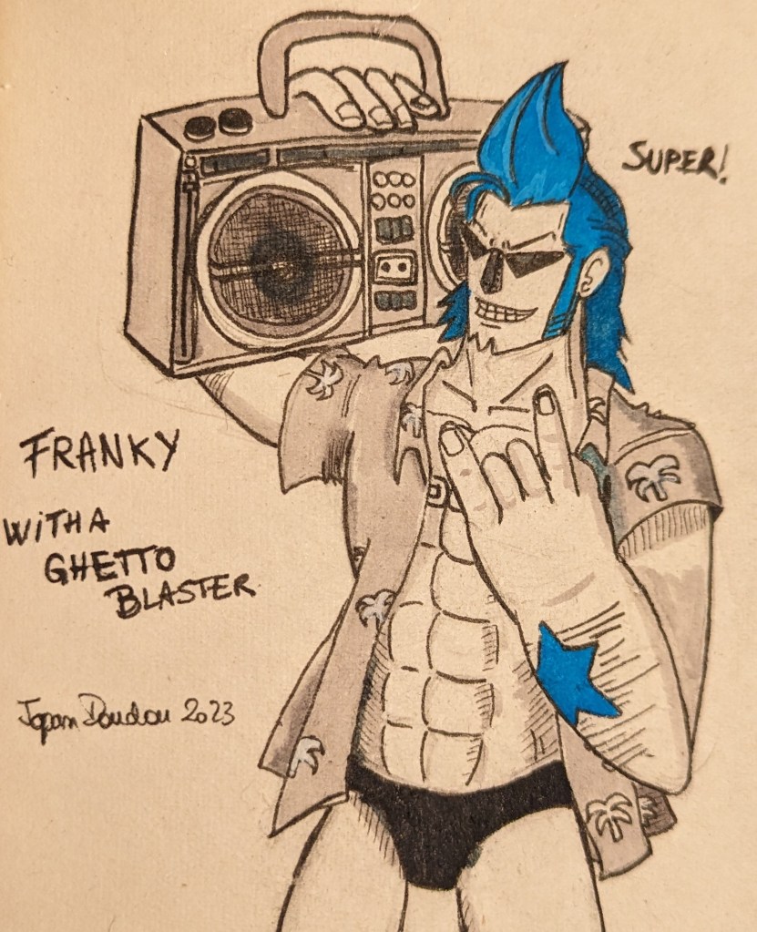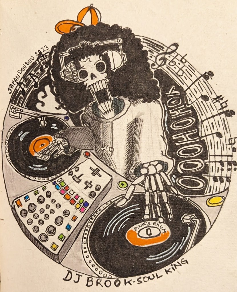 J’ai rencontré plusieurs challenges techniques lors de ce marathon de dessin. J’avais en tête Franky et Brook avec des appareils électroniques old school depuis longtemps, mais pas les compétences en dessin pour les représenter. Après plusieurs recherches, j’ai trouvé un panel d’images assez large pour dessiner la radio GhettoBlaster de Franky, caractéristique des années 80, et une platine de DJ des années 80 également pour Brook. Leur posture est un travail constant mais je m’améliore. Je tenais absolument à obtenir une perspective audacieuse pour certaines compositions. Ce fut le cas pour Jimbei, Robin et Brook ! Et paradoxalement, le dessin qui m’a demandé le plus de travail fut Nami, pour un résultat mitigé : sans ses cheveux roux, elle n’est pas trop reconnaissable… C’est pourquoi j’ai investi dans des feutres par la suite. Autre paradoxe, Usopp n’est pas mon personnage préféré, mais bizarrement, c’est mon dessin le plus réussi d’après moi, avec Brook!