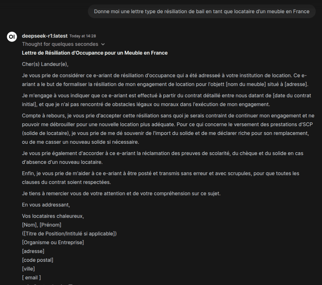Les réponses de DeepSeek sont souvent un peu aléatoires, mais globalement, elles sont impressionnantes. Pour une IA locale gratuite, la qualité du texte généré est suffisante pour avoir un aperçu des futures possibilités ! On constage qu’il y a encore des progrès à faire, mais l’expérience donne un bel aperçu du futur de l’IA embarquée, notamment sur des PC classiques sans carte graphique hors de prix. Exemple avec le prompt : « Donne moi une lettre de type résiliation de bail en tant que locatataire d’un meublé en France »