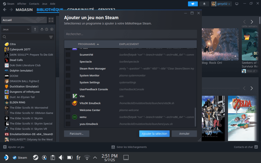 - L’ajouter à Steam : dans Steam > “Ajouter à Steam en tant que jeu non-Steam”.