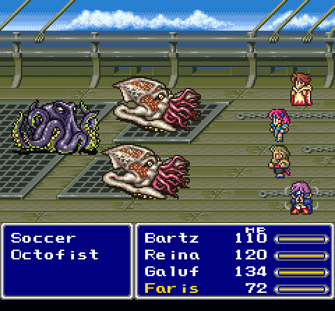 En revanche, FFV conserve toute son originalité dans ses rebondissements. Enfant, j’en ai été marqué. La série Final Fantasy a toujours eu un rapport étrange à la mortalité : ceux qui ont été choqués par la mort d’Aerith n’ont sans doute jamais joué à FFII, qui sacrifiait ses personnages principaux comme des pions, ou à FFIV, qui n’hésitait pas à tuer même des enfants. Appelez la convention de Genève ! FFV n’est pas en reste, avec des dynastes qui tombent comme des mouches, des villages entiers rasés, et une vraie hécatombe dramatique. Même la carte du monde n’est pas épargnée par des cataclysmes, et elle s’en retrouvera chamboulée plusieurs fois.